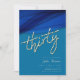 A glam, modern, elegant and chic 30th birthday party invitation template featuring a royal blue background with a chic voile, the word thirty covered in rhinestones (simulated, not real stones, this is a digital effect), modern calligraphy script and typography in a pale shade of gold. A chic, timeless design for a woman on her thirtieth birthday.