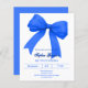 A white background, decorated with a large royal blue bow. Personalise and add a name and party details.