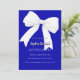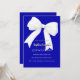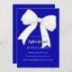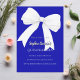 A royal blue coloured background, decorated with a large white bow. Personalise and add a name and party details.