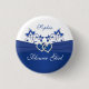 This personalised royal blue and white floral Flower Girl button with a PRINTED royal blue ribbon and a pair of PRINTED FAUX glitter and diamond jewel joined hearts brooch on it that matches the wedding invitation shown below. The text is customisable and so is the shape and size of the button. ****PLEASE note that if you change the shape to the that text may get cut off. It will print as it appears on your monitor, and you must allow adequate space around the edges, so do NOT run text right up to the edge. If you need anything changed, please email niteowlstudio@gmail.com.