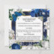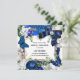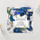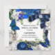 A beautiful royal blue square border frame is edged with faux gold and has delicate white and deep blue watercolor roses nestled on eucalyptus leaf foliage. A pretty blue satin bow with a faux diamond inlay appears across the top right corner and a delicate faux silver strand rests below it. Two stunning butterflies appear on the left and right edge and there are black templates on white for your personalised wording. These may be customised to suit a bridal shower; birthday party; special anniversary or for a business cocktail event.