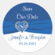 This round royal blue and white wedding envelope seal has a silver and royal blue filigree heart on top of a royal blue ribbon image running across the centre of the sticker. Above the ribbon the background colour is royal blue with white lettering that says, "Save Our Date" on it. Below the ribbon, the background colour is white with the names of the bride and groom and the wedding date in two different shades of royal blue. If you need any additional matching items, please email your request to niteowlstudio@gmail.com or use the Zazzle chat feature to get in touch.