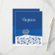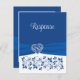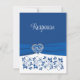 This romantic royal blue and white floral wedding RSVP card with meal choices has an image of a silver and royal blue filigree heart overtop a royal blue ribbon image running across the lower part of the response card with blue flowers on a white background below the ribbon and the word "Response" in large white script on a blue background above the ribbon. The backside has a royal blue and white background with your RSVP details and meal selections printed in two shades of royal blue with a royal blue heart at the top and a scroll frame surrounding the wording. If you need any additional matching items, please email your request to niteowlstudio@gmail.com or use the Zazzle chat feature to get in touch.