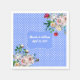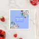 Pretty royal blue wedding napkins, with a white polka dot pattern background. Beautiful graphics of painted floral bouquets decorate two corners of the napkin, with a solid green text area, in the middle. Personalise with the bride and groom's names and wedding date. Matching products are available.