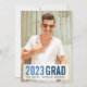 Fresh, modern 2016 graduation photo announcement or party invitation in cool shades of royal blue features your portrait orientated senior photo, with "201X Grad" and your name and school on a transparent white box. Add your party details to the back in cobalt blue and white; or, clear the back text to use as a simple graduation announcement.