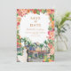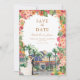 Hand-painted illustrations showcase the beauty of your venue with intricate details, including elegant palm trees and a romantic fountain, creating a sophisticated yet inviting aesthetic. The customisable text allows you to highlight your wedding date and details in an elegant script, making this design ideal for destination weddings, garden ceremonies, or elegant outdoor celebrations.