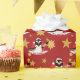 Christmas wrapping paper with an illustration of cute little royal penguin holding a sceptre and wearing a red Santa hat; Christmas holiday cartoon design for kids, on red background with customisable text template for your name or message; illustrated by Radka Kavalcova