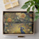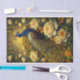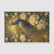 This opulent composition celebrates the majestic beauty of a peacock amidst a lush garden of cream and golden roses. The artwork masterfully combines Eastern decorative traditions with Western botanical detail, creating a richly layered visual feast. The peacock's iconic plumage, rendered in royal blues and gleaming golds, creates a natural mandala effect against the luminous background, while cream and butter-yellow roses unfurl in baroque abundance.