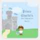 This cute boy's birthday party rounded square sticker has a Royal Prince Charming theme! There is a grey castle in the background with three blue flags flying at the top. At the bottom, there is an African Amercian ethnic Prince wearing a gold crown with a blue jacket. On the ground next to the prince, there is a red rose and a shield. On the right side, you can easily customise the birthday party information. Graphics by Zenware Designs at MyGrafico.com