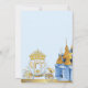 Sweet little princess with her crown and carriage in front of her castle. Done in blue & gold. Use for birthdays, baby showers or announcements.