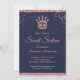 Invite your guests with this elegant sweet sixteen invitation featuring a beautiful rose gold crown and modern typography on a blue background. Simply add your event details on this easy-to-use template to make it a one-of-a-kind invitation. Flip the card over to reveal a faux rose gold glitter texture on the back of the card.