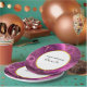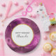 Birthday paper plates with a beautiful abstract design. Dark purple amethyst colour with ribbons of gold nestled between layered strata. Rich and beautiful design. Layered over top is a white circle frame with a faux gold foil border, with your personalised text inside.