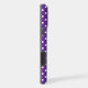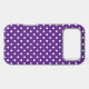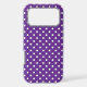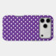 White polka dots on a royal purple background.