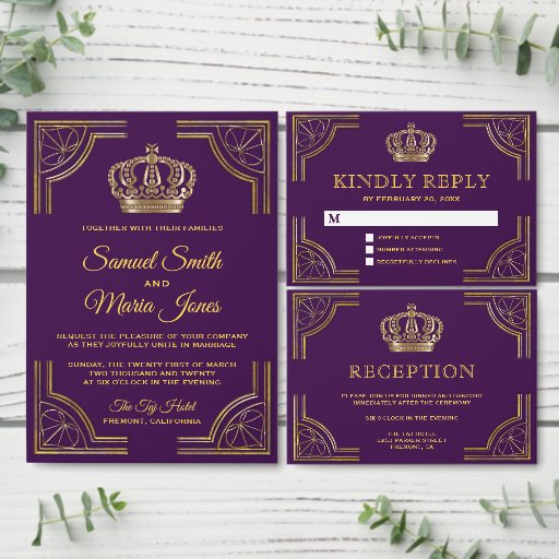 Royal Purple Gold Ornate Crown Wedding Invitation