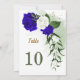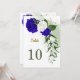 beautiful royal blue and white flowers with some green leaves and gold glitter table number card