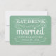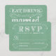 Eat, Drink, and be Married -- Vintage style rustic country wedding invitation RSVP Response Cards -- Swirly, curly scrolls and old-fashion typography on sage mint green burlap background. Add your names and wedding info in this easy to use template. Elegant but fun and whimsical, woodcut style with loose script calligraphy can be modified for your formal or semi-formal retro wedding theme. Casual modern country style is perfect for trendy rustic weddings with a fun touch of sophisticated charm for the traditional bride and groom. Please contact us for help with customisation if you need additional room for your wedding details. Other sizes and chalkboard styles available. Note: This is a paper card with a PRINTED image of burlap for decorative effect. There are no real or raised texture.