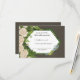 This RSVP card features a dark, earthy background with a soft, rustic feel. Easy to read lettering framed with lush greenery, delicate white roses, ferns, and lichens.