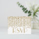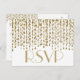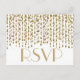 A pretty looking soft gold RSVP note card with strings of golden confetti on a white background. Design by Amelia Carrie for zazzle.com/GlitterInvitations Have a WONDERFUL event!!! Note: This is a graphic print of artwork and contains no messy glitter.