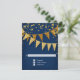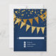 RSVP response return card with envelope. Sleek. Modern. Chic. Understated glam - with glittering pennant banners in two shades of golden glitter with sparkling twinkling falling confetti in various sizes and shade of gold. Sparkly starburst shining stars highlight the sparkle. A very contemporary typography text layout that is anything but traditional. It is simple and short. It says to your guests, "We're throwing a party and it will be the party of a lifetime!" For the elegant but non-traditional bride and groom. COLORS: deep dark royal navy sapphire cobalt blue and gold, golden glitters. Especially suited for fall or winter weddings, New Year's Eve Parties, Birthday parties and Anniversary party announcements.