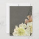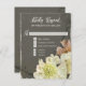Matching RSVP Response cards that include menu choices, these return by mail with white envelopes at no charge. Beginning with a subtle texture of a vintage damask swirl, layered with charcoal grey leaf scrolls and a roughly painted edge, this design then adds hand painted pastel flowers. These are Scabiosa pincushion flowers a retro English garden style flower that has an eclectic contemporary hip vibe in this colour way.