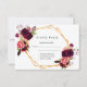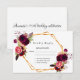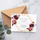 An elegant RSVP card with templates for reply by date, name etc. Watercolored feathers and roses, flowers in burgundy. A faux gold and white frame. A white background on front, black text.