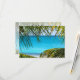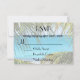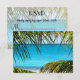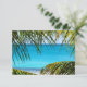 A vacation getaway wedding rsvp. A gorgeous photograph of a tropical beach. The water is crystal clear and azure blue. The image is framed with some sheltering palm fronds. The beach has nice white sand. A very calming relaxing image.