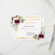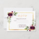 An elegant RSVP card for a wedding with templates for reply by date, names etc. A faux gold frame with bohemian, boho style watercolored roses flowers in burgundy. White background, burgundy and golden coloured letters.