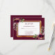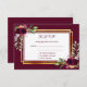 An elegant RSVP card for a wedding with templates for reply by date, names etc. Bohemian, boho style watercolored feathers and roses, flowers in burgundy. A faux gold and white frame. Dark burgundy background and text.