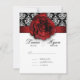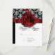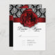 Classy wedding rsvp response card with elegant red rose and damask pattern.