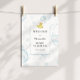Welcome guests to your baby shower with this beautiful poster, featuring a blue frame surrounded by bubbles and a yellow rubber duck. Add the guest of honor's name, shower date and custom welcome text using the fields provided.