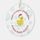 Illustration of a yellow rubber duck bath toy wearing a santa hat surrounded by bubbles. Personalise with baby's name and year. Personalise the photo on back.
