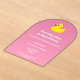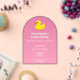 Make a splash with this adorable yellow rubber duck birthday invitation—perfect for water-loving little ones! With its arch-shaped acrylic design and a dreamy pink gradient background, it brings a fun, girly beach vibe to your party planning. Customise it easily with your celebration details and get ready for some squeaky-clean birthday fun!