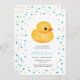 Cute and sweet baby shower invitation which features an adorable rubber duckie and blue and yellow confetti spots.