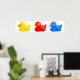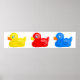 Cute cartoon illustration of three different coloured ducks floating together in a row. Image available on various gifts and products.