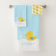 Quack, quack! The Rubber Ducky With Blue Heart Bath Towel Set designed by Enchantfancy Design Company features a cute yellow duck with a blue heart on his wing. The yellow rubber ducky is floating on bath bubbles. Personalise with your choice of name! These towels make an adorable baby gift or gift for a young child.