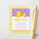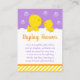 This cute and fun display shower enclosure card features an adorable yellow duck and duckling in white soapy bath bubbles on a bright purple background with an orange ribbon and yellow stripes. The text combines handwritten script and sans serif fonts for a stylish and modern look. This is perfect for a Baby Shower.