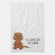 Destei's original cartoon illustration of a cute ruby colour Cavalier King Charles Spaniel breed dog who is sitting. The background has a pattern of grey dog paw prints. There is also a personalizable text area next to the dog illustration.