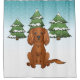 Destei's original cartoon illustration of a cute ruby colour Cavalier King Charles Spaniel breed dog. The dog is placed in a winter scene. In the scene it is snowing in the background and there are three green fir trees behind the dog. The trees have some snow on them. The background is a light blue to white gradient giving this design that freezing cold winter day look.