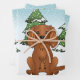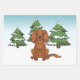 Destei's original cartoon illustration of a cute ruby colour Cavalier breed dog. The dog is placed in a winter scene. In the scene it is snowing in the background and there are three green fir trees behind the dog. The trees have some snow on them. The background is a light blue to white gradient giving this design that freezing cold winter day look.