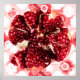 Awesome ripe, ruby, fresh slice garnet fruit on pink and white floral background with gentle flowers.