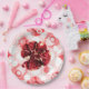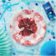 Awesome ripe, ruby, fresh slice garnet fruit photo on pink and white fractal floral background with gentle flowers.