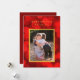 This photo holiday card features your photo and the words "Happy New Year" in faux gold foil against a ruby red bokeh lights pattern background. Card has a dark red background back side.