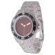 Has heft and feel of expensive stainless steel quartz watches. Good band with safety catch. I removed links, which is easy because engraved arrows show direction to push the linking pins. As always by this seller, the image (a railroad logo) is a perfect reproduction of my emailed image, and is precisely spaced and aligned.
