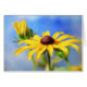 Rudbeckia, Black-eyed Susan, flower and buds, are bright and cheery against a blue background, in our New Hampshire garden.