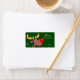 Rudolf the red nosed reindeer character on a green snowy background. Cute Christmas gift tag sticker design.