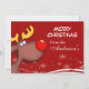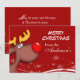 Rudolf the red nosed reindeer character on a red snowy background. Cute Christmas greeting card design.