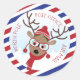 Wrap up mailing or your holiday gift with a pretty round seal that features an air mail envelope's borders in dark blue and red. It has an illustration of Rudolph the reindeer in a cosy scarf and winter hat. North Pole Post Office uses airmail all the time because all Christmas mail must arrive on time. The personalizable text reads NORTH POLE - POST OFFICE - AIR MAIL