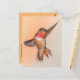 Postcard featuring an orange rufous hummingbird in flight, in a stunning pose, with his head tilted towards you as if to say "I see you, do you see how glorious I am!" He is really showing off his spectacular brilliant orange throat feathers (gorget). This is a unique beautiful card for hummingbird, nature and garden lovers. Photo taken at Pasadena, California.