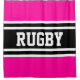This sporty, athletic design features bold RUGBY text inside a highlighted wide black and white double racing stripes against bright pink outer stripes. The text in this design can be personalised.