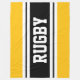 This sporty, athletic design features bold RUGBY text inside highlighted horizontal black and white racing stripes against bright orange yellow outer stripes. The text in this design can be personalised.